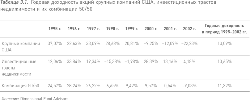 Инвестор, не имеющий склонностей к математике, может усвоить эту важную концепцию с помощью приведенных ниже данных о доходности двух классов активов – акций крупных компаний и инвестиционных трастов недвижимости США в период с 1995 по 2002 г. – и портфеля, сформированного из первых и вторых в соотношении 50/50 (см. табл. 3.1).