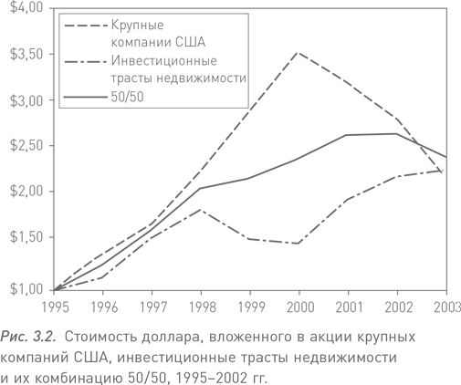 Обратите внимание, что худшим для крупных компаний США оказался 2002 г., когда их убытки составили 22,23 %, а для инвестиционных трастов недвижимости таким годом стал 1998-й, когда они потеряли 15,38 %. А теперь заметьте, что в 2002 г., самом неудачном для портфеля, состоящего из данных активов в соотношении 50/50, он потерял всего лишь 9,03 %, а его среднегодовая доходность выше, чем у каждой из составляющих в отдельности.