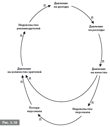 На рис. 5.18 снова представлена диаграмма цикличной причинности из примера о телекомпании. Как мы уже видели, она образована двумя усиливающими петлями, которые еще и усиливают друг друга, и, когда эти петли действуют как круги процветания, а не порочные круги, их взаимодействие служит мощным стимулятором роста.