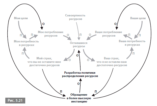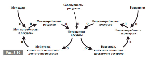 Данная структура формируется с помощью двух взаимосвязанных усиливающих петель, движимых двумя входными звеньями – нашим взаимным желанием достичь своих целей – и третьим входным звеном, обозначающим совокупность ресурсов. В результате действия этой системы дефицитные ресурсы становятся еще более дефицитными, так как мы с вами продолжаем конкурировать с каждым витком усиливающей петли.