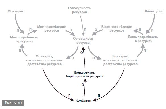 Присутствие конфликта добавляет нам еще две петли: по мере роста уровня конфликтаколичество конкурентов, борющихся за ресурсы, постепенно сокращается (следовательно, связь типа О), и по мере сокращения числа конкурентов количество оставшихся ресурсов увеличивается (еще раз О). Поэтому, если я победил, это уменьшает мой страх, что вы не оставите мне достаточно ресурсов, что снижает вероятность дальнейшего конфликта, хотя бы на некоторое время.