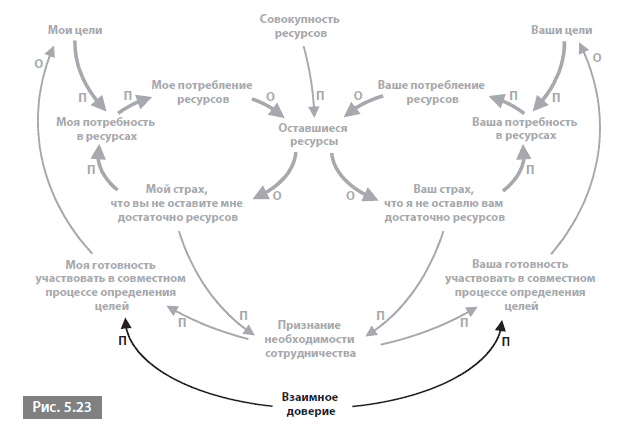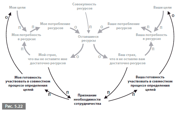 Однако давайте не будем сгущать краски, потому что существует и третий вариант (рис. 5.22). Вместо конкуренции за ограниченные ресурсы игроки могут увидеть смысл в сотрудничестве и договориться, как лучше поделить их. Чем сильнее мое признание необходимости сотрудничества, тем сильнее мое желание участвовать в совместном процессе определения целей, а его результаты повлияют на мои цели, которые будут соответствовать ресурсам, оставшимся для каждого из нас. Вместо того чтобы спорить, как поделить оставшиеся ресурсы, мы договоримся о своих целях и ограничим наше потребление в соответствии с ними. При таком подходе также появляются две уравновешивающие петли, но они взаимодействуют с усиливающими петлями по-другому. Посмотрите на диаграмму.