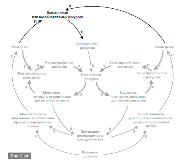 Если я не доверяю вам, я буду сидеть за столом переговоров и улыбаться, но у вас за спиной буду делать все, что захочу. Может быть, вам стоит подтвердить свои слова, сперва ограничив собственные цели, но тогда почему вы должны верить, что я сделаю то же самое? Однако если мы можем доверять друг другу, разумеется, этот подход гораздо жизнеспособнее, особенно если мы договоримся поискать способы увеличения совокупности ресурсов. Возможно, часть ресурсов, которые я потребил бы в противном случае, лучше посвятить поиску новых или возобновляемых ресурсов, потому что я не только вижу необходимость ставить больше целей, но мои и ваши цели равняются друг на друга (рис. 5.24).