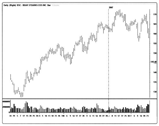 Рис. 6.2. Дневной столбиковый график акций Bear Stearns (BSC). Вот точно та же последовательность котировок акций Bear Stearns (BSC), что и на рис. 6.1. Однако на этот раз динамика цен изображена на дневном столбиковом графике.