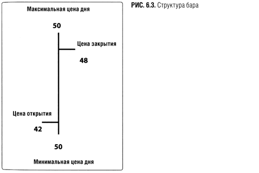 На рис. 6.3 показаны компоненты ценового бара. Верхний конец бара изображает «максимум» акции, т. е. максимальную цену дня. В данном случае максимум равен 50. Нижняя часть бара показывает минимальную цену за период, у нас это 40. Небольшая перпендикулярная черта слева отмечает цену открытия (42). Такая же черта справа показывает цену закрытия (48).