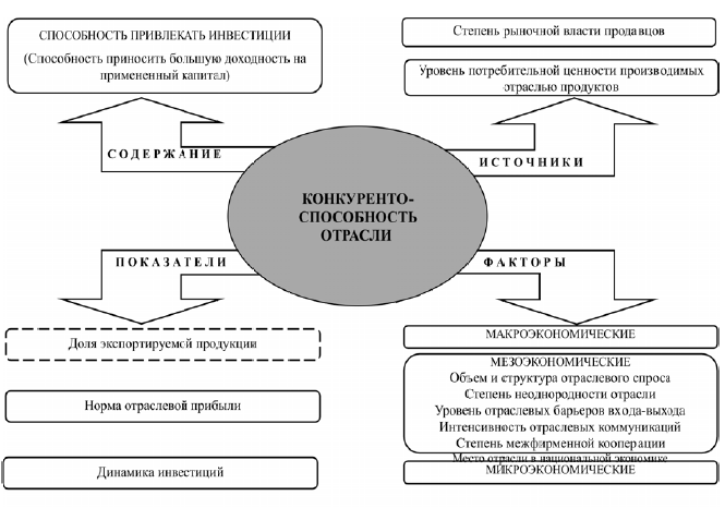 Капиталы всегда стремятся в отрасли, где потенциально существует большая норма прибыли. Если рассматривать конкурентоспособность отрасли как ее способность к выживанию и развитию, что вполне обоснованно с точки зрения действия законов конкуренции, то легко прийти к выводу о том, что конкурентоспособность отрасли определяется ее привлекательностью для инвесторов. В этой связи определение конкурентоспособности отрасли наличием у нее преимуществ, которые позволяют действующим в отрасли фирмам производить продукцию с издержками не выше мировых и создавать условия для роста потенциала конкурентоспособности этих фирм, больше отвечает природе мезоконкуренции. Его недостаток состоит в том, что оно указывает на источники конкурентоспособности, а не на ее содержание. Содержательная сторона явления состоит в том, чтобы отразить причину, которая делает возможным существование этих источников, т. е. обусловливает способность отрасли перераспределять прибыль в свою пользу. Учитывая, что достигнутая, а тем более будущая эффективность производства определяются притоком в отрасль инвестиций, смело можно утверждать, что конкурентоспособность отрасли должна определяться как способность привлекать новые инвестиции в отрасль. Конкурентоспособность отрасли можно было бы определить и как способность обеспечивать более высокий уровень доходности на примененный капитал, что было бы лишь перефразировкой первого определения. Преимущество первого состоит в том, что оно подчеркивает конкурентный характер взаимодействия между отраслями: при прочих равных приток капитала в одну отрасль ограничивает возможности притока капитала для других отраслей. Кроме того, оно отражает динамику процесса и тем самым характеризует конкурентоспособность отрасли в динамическом аспекте. Причем оно больше отвечает глобальному характеру современных отраслей.