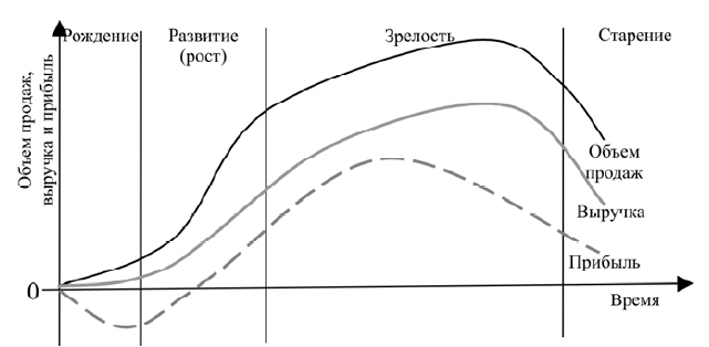 Основой для оценки отраслевой конкурентоспособности может послужить жизненный цикл отрасли. Какие бы факторы не действовали и как бы они не действовали, любая отрасль подвержена определенному жизненному циклу. Жизненный цикл отрасли (ЖЦО) – следствие развития производительных сил общества, выражающегося в смене технологических укладов и общественных потребностей. Он включает четыре стадии: рождение, развитие, зрелость и старение. Каждая стадия отражает изменение во времени различных свойств отрасли: темпы роста объема продаж, динамику продуктовой номенклатуры и технологические особенности, специфику состояния внутриотраслевой конкуренции и структуры отраслевого рынка, динамику показателей выручки и прибыли (рис. 6.15).