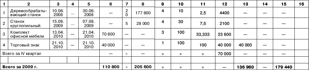 За период с сентября по декабрь 2009 года была начислена амортизация в размере 2000 руб. (500 руб. • 4 мес). Остаточная стоимость станка на 1 января 2010 г. составила 28 000 руб. (30 000 руб. – 2000 руб.).