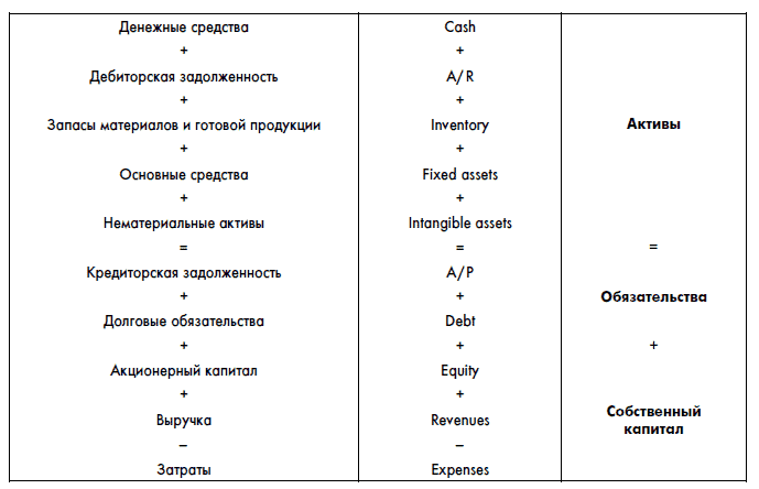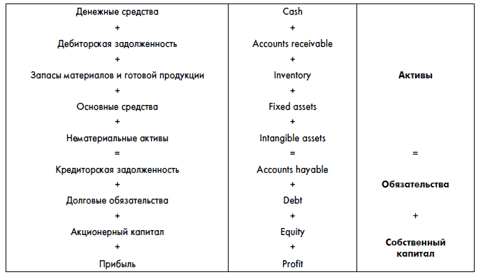 Покупаются все эти замечательные активы за счет пассивов (в английском слова «пассив» нет, поэтому эквивалентным понятием будет liabilities and shareholders’ equity – обязательства и собственный капитал), включающие: