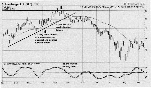 Рисунок 5-10. 4 февраля Родз купил акции компании Schlumberger вследствие бычьей ситуации в нефтяном секторе и технически сильной картины. Месяц спустя позиция была закрыта с прибылью после того, как цена не смогла пробить двойную вершину.