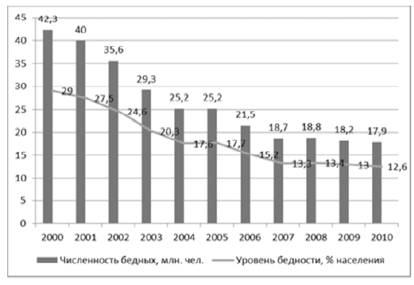Быстрый экономический рост в начале 2000-х годов сопровождался высокими темпами роста доходов населения. Реальные доходы населения выросли в 2,5 раза при незначительном росте неравенства (коэффициент Джини в 2011 г. составил 0,42 по сравнению с 0,4 в 2000 г.). Увеличение прожиточного минимума населения в первое десятилетие XXI в. в основном было связано с его индексацией на темп роста индекса потребительских цен, поэтому наблюдался рост отношения реальных доходов населения к прожиточному минимуму (с 1,89 в 2000 г. до 3,32 раза в 2010 г.). В результате численность населения с доходами ниже прожиточного минимума и уровень бедности сократились к 2010 г. в 2,3–2,4 раза: численность бедного населения – с 42,3 млн. до 17,9 млн. чел., уровень бедности – с 29 до 12,6 % (рис. 8). Уровень дефицита денежных доходов населения снизился за тот же период с 5 до 1,2 % общего объема денежных доходов [136 с. 363].