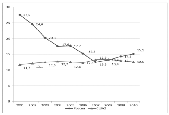 Рис. 9. Динамика доли бедного населения в США и России, в % от общей численности населения, в 2001–2010 гг.