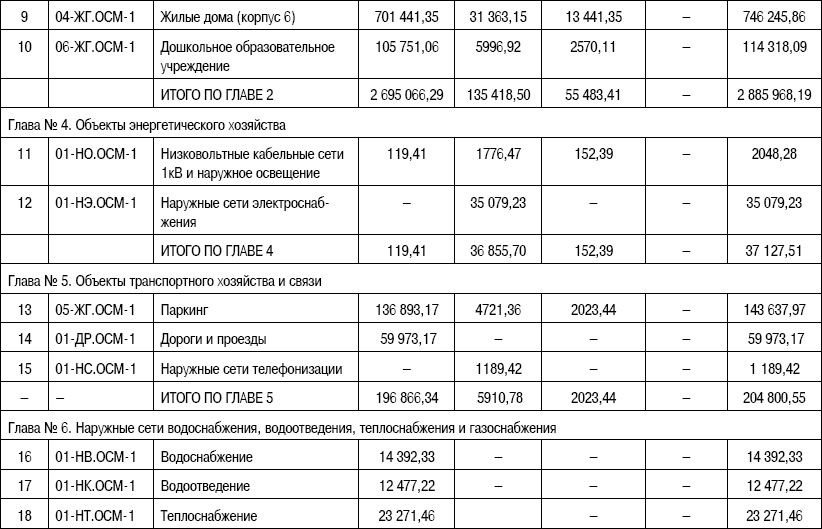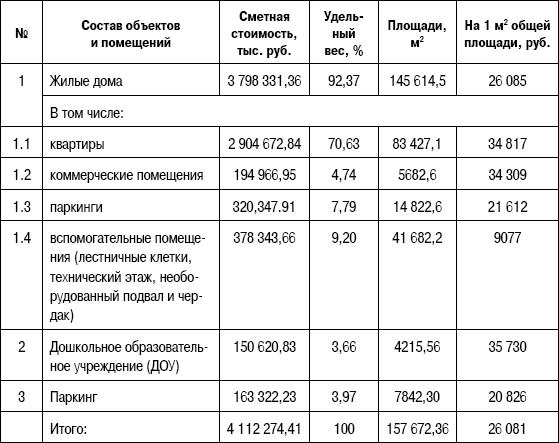 Сводный сметный расчет на стадии проектной документации составлен на основе локальных смет на общеплощадочные работы и затраты и объектных смет на отдельные здания и сооружения: жилые дома, детские образовательные учреждения, паркинги (табл. 7.3).