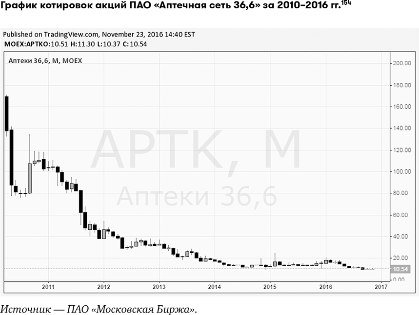 На графике видно, что цена акций ПАО «Аптечная сеть 36,6» с 2011 г. постоянно падала. В начале 2010 г. акция стоила 140–170 руб. К ноябрю 2016 г. ее цена опустилась почти на 93 %, и акция стала стоить около 11 руб. Тем, кто купил акции компании в 2010 г., видимо, не доставило удовольствия наблюдать, как сумма их инвестиций уменьшилась почти в 15 раз. Более того, скажу, что в 2008 г. одна акция ПАО «Аптечная сеть 36,6» стоила 1400 руб.155