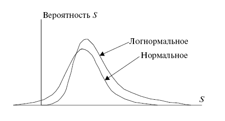 Первый мотив перехода к стандартному отклонению как двусторонней оценке риска – простота вычислений. Второй мотив – фиксация на фондовом рынке нормальности кривой распределения доходности, например, по акциям. Действительно, на небольших временйых интервалах распределение доходности ценных бумаг (акций) можно признать близким к нормальному (Гауссову) распределению, которое симметрично относительно среднего значения доходности (равного медианному и модальному значению) или к логнормальному. Хотя существуют финансовые активы, которые явно не соответствуют таким предположениям нормальности или логнормальности распределения доходности. Графически различия между нормальным и логнормальным распределением богатства S показаны на рис. 9.1.
