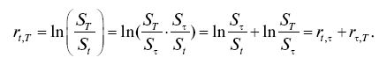 . При работе с финансовыми активами довольно часто используют логарифмическую доходность. Преимущество ее использования двояко: во-первых, она может быть экономически более содержательной, чем процентная доходность. Если логарифмическая доходность распределена нормально, распределение не приведет к отрицательной цене (в «левом хвосте» распределения логарифмы отношения цен стремятся к «минус бесконечности» при текущей цене, стремящейся к нулю. Напротив, в «левом хвосте» нормально распределенной доходности величина стремится к «минус бесконечности» при отрицательной величине текущей цены, что экономически бессмысленно). Второе преимущество логарифмических доходностей состоит в том, что они хорошо агрегируются во времени. Логарифмическая доходность от момента времени t до момента времени Т эквивалентна сумме логарифмических доходностей на интервалах от t до ? и от ? до Т, где t? ? ?T:
