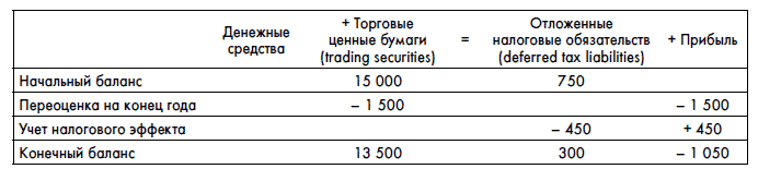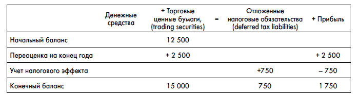 31 декабря 2006 г. акции ССС торгуются на бирже по 30 руб. за акцию. АВС не стала продавать их и по-прежнему владеет акциями ССС. В этом случае изменение стоимости ценной бумаги, несмотря на то что компания АВС акции не продала, должно быть отражено в отчете о прибылях и убытках ((30–25) ? 500 = 2500). Кроме того, не надо забывать еще и о необходимости указать налоговый эффект такой прибыли (2500 ? 30 % = 750 руб.). Однако, поскольку налог реально будет уплачен только в момент продажи акций, компания должна отразить возникшее налоговое обязательство как отложенный налог: