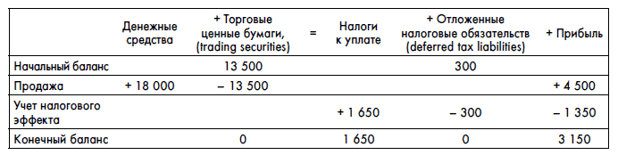 14 февраля 2008 г. АВС продала все имеющиеся у нее акции ССС по 36 руб. за акцию. Компания получила 500 ? 36 = 18 000 руб. и продала имеющиеся активы. Продажа активов приводит к получению реальной прибыли и необходимости уплаты налогов. Не забывайте, что государству надо будет заплатить все налоги с начальной цены покупки, т. е. с 25 руб. Сумма налога к уплате составит (36–25) ? 500 ? 30 % = 1650 руб. Из них часть будет связана с уже отраженными отложенными налогами: