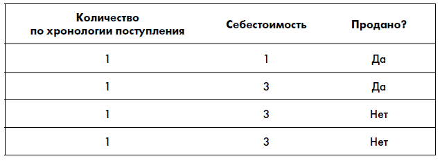 В первый год компания продала 2 единицы товара. Одна – себестоимостью 1 руб., а другая – себестоимостью 3 руб. (это первые две единицы товара, купленные компанией АВС в хронологическом порядке):