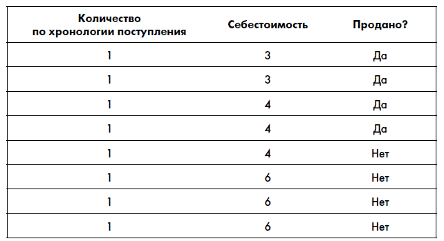 В этом случае прибыль компании составит 20 – (1 ? 1 + 1 ? 3) = 16 руб. В товарных запасах на конец первого года будет отражено 1 ? 1 + 3 ? 3–1 ? 1–1 ? 3 = 6 руб.