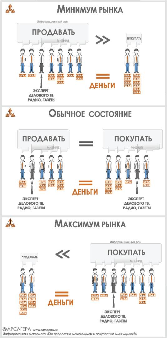 Из наших материалов Вы знаете, что мы в УК «Арсагера» не пытаемся играть на колебаниях рынка. Мы и Вам не советуем этим заниматься. Однако тяга людей к внезапному и стремительному обогащению непреодолима. Многим кажется, что можно научиться предугадывать минимумы и максимумы рынка. Здесь мы решили поделиться интересным наблюдением относительно того, кому же это удается. В этом материале не будет рассуждений на тему кукловодов и конспирологии, мы не сможем Вам назвать конкретные фамилии или названия компаний. Это просто наблюдение, а точнее логическое рассуждение.