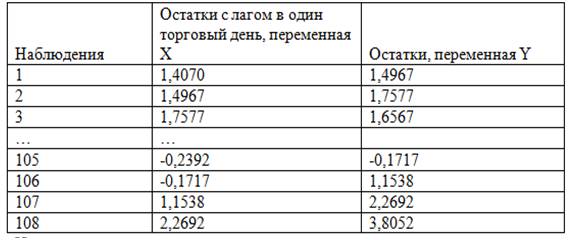 Например, при наличии автокорреляции со сдвигом (лагом) в один период времени (в данном случае в один торговый день) величина остатка наблюдения 1 влияет на величину остатка наблюдения 2, а величина последнего ? на величину остатка в наблюдении 3 … И так далее.