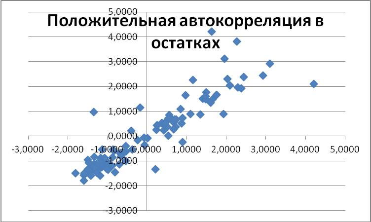 Выявить автокорреляцию в остатках можно: либо с помощью критерия Дарбина-Уотсона (см. подробности – стр. 436-442, в Эконометрика: Учебник/И.И.Елисеевой, С.В. Курышева, Т.В. Костеева и др.; Под. ред. И.И.Елисеевой. ? 2-е изд., перераб. и доп. – М.; Финансы и статистика, 2006), либо построив точечный график остатков с определенным лагом (отставанием).