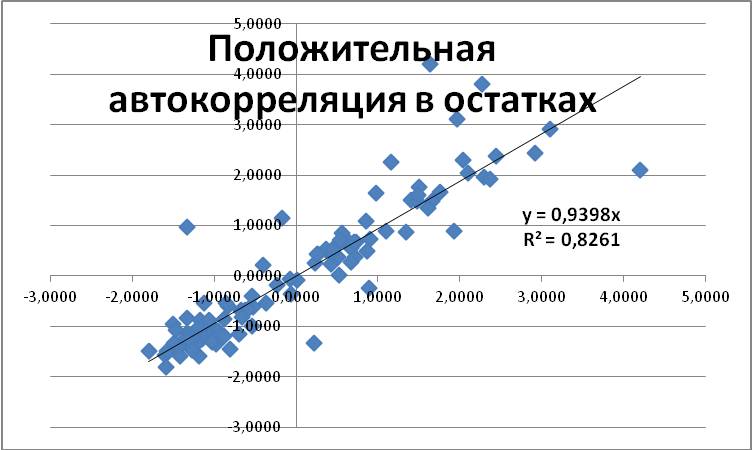 В результате получим следующий график зависимости «Остатков» от «Остатков с лагом в один торговый день»? см. рис.2.5. Судя по тому, что точки на графике растут слева направо, можно сделать вывод о наличии положительной автокорреляции в остатках.