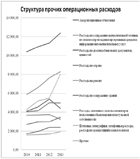 Выявлено: – рост амортизационных расходов; – снижение расходов на ремонт в последний период; – рост расходов на ИТ (достаточно стабильный – около 10 % в год);– рост Прочих расходов[14], особенно за последний период; – снижение расходов по доставке банковских документов в последнем периоде после равномерного роста в предыдущие периоды.