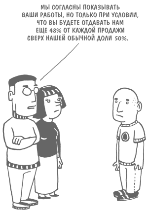 Многие галереи рассылают коллекционерам пригласительные или пишут им на электронную почту (или делают и то и другое). Стиль и формат подобных посланий от выставки к выставке обычно не меняются – они позволяют легко узнавать конкретную галерею и выделяют ее из числа остальных. Вы, конечно, можете попросить изменить что-нибудь в стандартном шаблоне – что-то, что будет рассказывать именно о вашем творчестве, но не удивляйтесь, если вам откажут. То же относится и к каталогам, брошюрам и объявлениям. Вы получаете то же, что и остальные, то есть в данной конкретной ситуации – ничего. На это есть обоснованная причина: дороговизна рекламы (объявление на всю страницу в специализированном журнале, например, обходится весьма недешево), смысла в которой довольно мало (по крайней мере до тех пор, пока вы не станете знамениты). С пониманием к подобному предложению отнесутся, только если вы выразите желание оплатить все необходимые расходы. В этом случае галерея с радостью все подготовит и отредактирует.