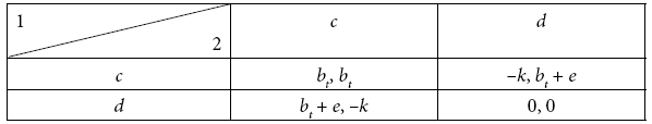 где b0, k, e > 0, и у игроков общий фактор дисконтирования ? ? (0, 1). В модели четыре параметра: ?, b0, k, и e; bt – это квазипараметр, поскольку на него может влиять наличный институт. Интересующий нас институт порождает кооперацию, т. е. разыгрывание стадийной игры (c, c).