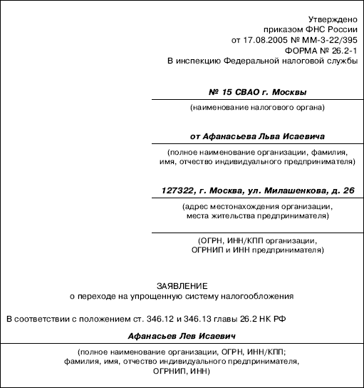 Если предприниматель выбрал упрощенную систему налогообложения, то заявление о переходе составляется по форме № 26.2-1, утвержденной приказом ФНС России от 17.08.2005 № ММ-3-22/395.