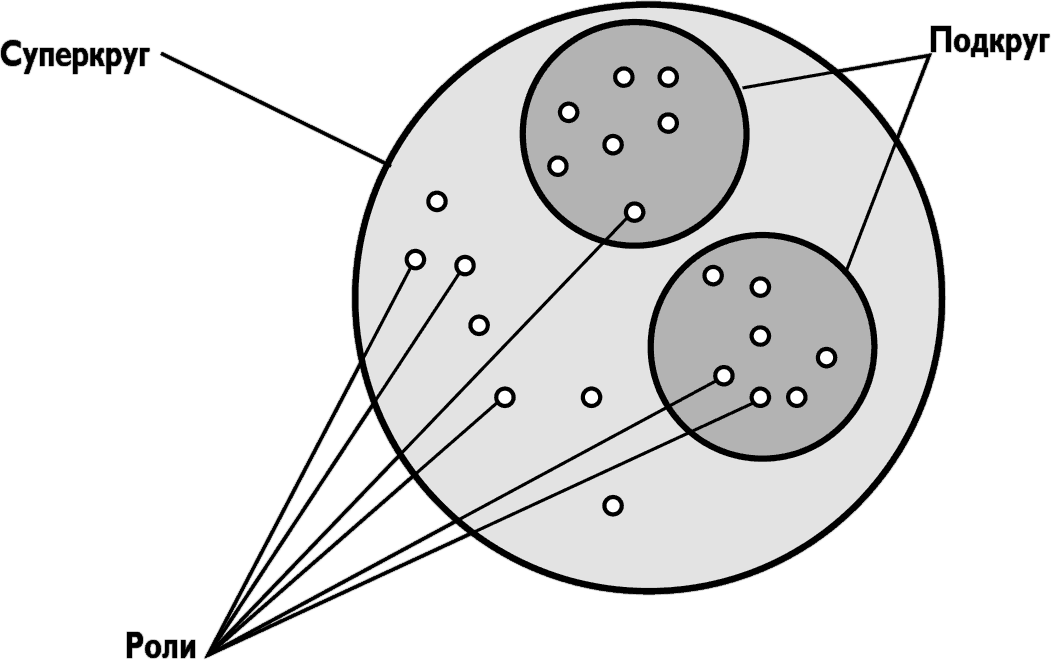 Иногда круг образуется, когда обязанности той или иной роли усложняются настолько, что для эффективной их реализации требуется большая дифференциация. Например, небольшой стартап в начале своей деятельности располагает одной общей ролью «маркетинг», которую исполняет один человек, но по мере роста компании может возникнуть потребность дифференцировать маркетинговую деятельность, так что понадобится уже несколько взаимосвязанных ролей, которые будут исполняться несколькими сотрудниками. Так роль «маркетинг» вырастает в круг «маркетинг», и эта деятельность разделяется на несколько направлений. Теперь в этом круге могут быть такие роли, как «социальные сети», «реклама», «интернет-маркетинг» и «развитие бренда». Постепенно роль «социальные сети» может усложниться настолько, что одному человеку исполнять ее станет не под силу, и тогда ее обязанности распределятся между двумя или тремя ролями, так что появится новый круг «социальные сети», являющийся «подкругом» в «суперкруге» «маркетинг». Но независимо от масштаба и специализации круга все они действуют по одним и тем же общим правилам.