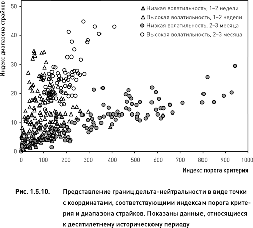 • Во время волатильного рынка границы дельта-нейтральности располагаются в области более низких значений диапазона страйков, чем во время спокойного рынка. Этот вывод (справедливый как для портфелей, состоящих из ближайших опционов, так и для портфелей, сформированных из дальних опционов) основан на более низком расположении большинства заполненных кружков и треугольников относительно контурных кружков и треугольников по вертикальной оси рис. 1.5.10.