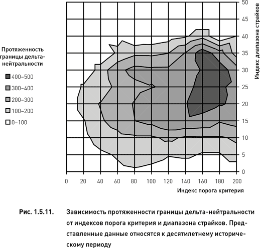 Теперь мы переходим к рассмотрению протяженности границ дельта-нейтральности. Эта характеристика очень важна, поскольку более длинные границы обеспечивают возможность построения большего количества вариантов дельта-нейтрального портфеля (путем манипуляции значениями параметров «порог критерия» и «диапазон страйков»). Зависимость длины границы от индексов дельта-нейтральности и порога критерия показана на рис. 1.5.11. Самые длинные границы находятся в области высоких значений порога критерия и среднего значения диапазона страйков. Это означает, что, для получения более протяженной границы дельта-нейтральности следует использовать средний диапазон страйков и выбирать комбинации, имеющие высокие значения критериев. Снижение величины порога критерия приводит к сокращению границы. Тот же эффект возникает как при сужении, так и при расширении диапазона страйков.