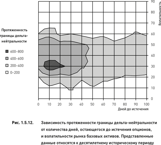 Зависимость протяженности границ дельта-нейтральности от волатильности рынка и от времени, остающегося до истечения опционов, показана на рис. 1.5.12. Наибольшей длины граница достигает при средней волатильности и коротком промежутке времени до экспирации. При использовании опционов, до истечения которых остается менее 10 дней, протяженность границы сокращается. Использование более долгосрочных опционов (более 20 дней до истечения) также приводит к сокращению границы дельта-нейтральности. Независимо от количества дней, остающихся до экспирации, протяженность границы дельта-нейтральности сокращается как при снижении, так и при росте волатильности.