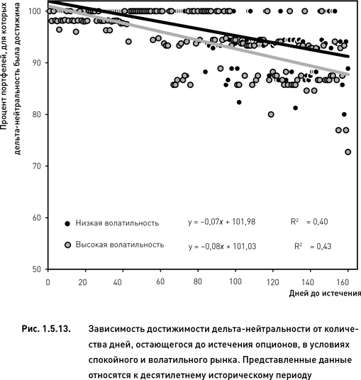 Дельта-нейтральность оказалась достижимой во всех случаях, когда портфели были сформированы менее чем за 40 дней до даты истечения опционов. При использовании более долгосрочных опционов достижимость дельта-нейтральности снижается. Однако это снижение происходит более медленными темпами, чем в случае дельта-нейтральной стратегии (сравни рис. 1.5.13 и 1.4.10). Волатильность рынка не оказывает статистически значимого влияния на зависимость достижимости дельта-нейтральности от количества дней до экспирации. Это подтверждается несовпадением линий регрессии (и близостью их углов наклона), соответствующих низковолатильному и кризисному периодам. Разность наклонов линий регрессии статистически незначима (t = 1,65, p = 0,10). В этом отношении частично-направленная стратегия также отличается от дельта-нейтральной, для которой достижимость дельта-нейтральности зависит от состояния рынка (при высокой волатильности достижимость дельта-нейтральности ниже).