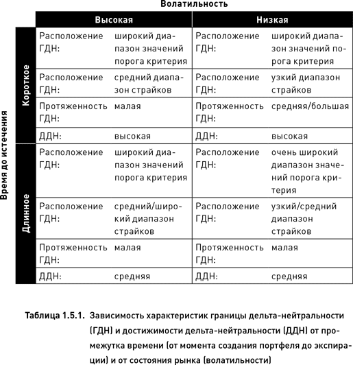 Все описанные выше характеристики границ дельта-нейтральности суммируются в таблице 1.5.1. Аналогичная таблица была приведена ранее для дельта-нейтральной стратегии (таблица 1.4.1). Сравнивая эти две таблицы, легко определить отличия между двумя стратегиями. Рассмотрим различные сочетания значений (волатильность рынка ? период времени до экспирации опционов) и сравним их влияние на характеристики границ дельта-нейтральности для двух стратегий. Влияние более половины сочетаний неодинаково для двух стратегий. В частности, можно отметить следующие отличия.