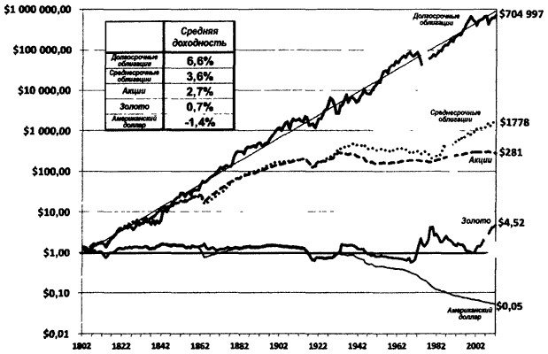 Его слова подтверждаются историческими данными. Взгляните на рисунок, отражающий доходность акций и облигаций на протяжении 100 и 200 лет. Из него следует, что в историческом плане американские акции всегда превосходили облигации по доходности. Один доллар, вложенный в 1802 году в акции под 8,3 процента годовых, вырос бы к началу нынешнего тысячелетия до 8,8 миллиона.