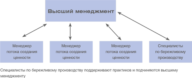 Как отмечалось ранее в этой книге, ответственность за совершенствование потока создания ценности в первую очередь несет менеджмент. Руководители должны понимать, что их роль состоит в видении всего потока, разработке видения улучшенного будущего состояния потока и лидерстве на пути его достижения. Вы не можете делегировать ответственность. Вы можете попросить основные подразделения попытаться устранить потери, но только менеджмент имеет возможность видеть весь поток, невзирая на границы структурных и функциональных подразделений. На основании обобщенного нами опыта работы со многими компаниями в различных отраслях промышленности за последние пятнадцать лет мы можем утверждать, что нужно следующее: