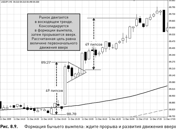 На рис. 8.9 показан бычий вымпел на 5-минутном графике USDJPY, сформировавшийся после неожиданного экономического отчета. Цена резко пошла вверх, создав флагшток. Я редко покупаю во время первоначальной реакции на неожиданные события. Коррекции могут быть огромными, и на рынке все еще сохраняется риск, связанный с событием.