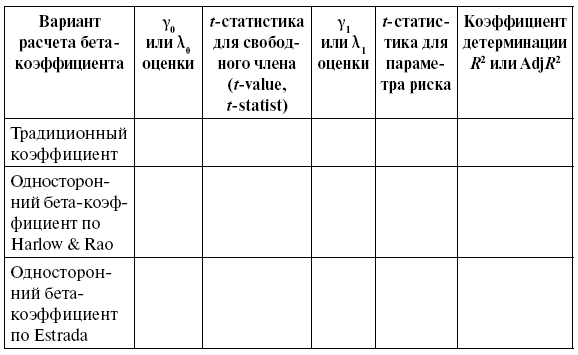 Факторы риска были отдельно рассчитаны для трех временных горизонтов: 2004–2007, 2008–2010, 2004–2010. Тестировались четыре разных меры систематического одностороннего риска (downside systematic risk): модель Бава – Линденберга с BL-beta, модель Харлоу – Рао с HR-beta, модель Хогана – Варрена с H-Wbeta и модель Эстрады с E-beta. В рамках этих четырех спецификаций моделей тестировалось также влияние выбора бенчмарка (т) на объяснительную способность модели (рассмотрены следующие варианты: нулевая доходность, безрисковая ставка, средняя доходность для каждого актива, рыночная доходность как ц). Аналогичная двухшаговая процедура была применена и для новой меры риска X. Эстрады (GLS).