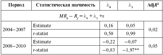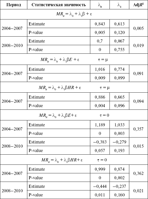 Рассмотрение объяснительной способности (cross-sectional analysis) различных спецификаций САРМ показало, что объяснительная сила традиционного бета-коэффициента находится на уровне 0,5 % (R2 = 0,005 в однофакторной регрессии по недельным значениям доходности). На отрезке с 2008 по 2009 г. объяснительная способность еще меньше. Замена в однофакторной модели традиционного бета-коэффициента на односторонние меры риска (downside measures – ?Е и ?HR) повышает объяснительную способность, но только на периоде финансовой стабильности. Для периода финансовой нестабильности преимущества односторонних мер риска не выявляются (ни с какими значениями бенчмарка). Лучшей мерой по объяснительной способности для периода 2004–2007 гг. является односторонний бета-коэффициент Харлоу – Рао (HR-бета) с бенчмарком (target return), равным нулю ? = 0 (R2 = 36,2 %) (см. табл. 9.18).