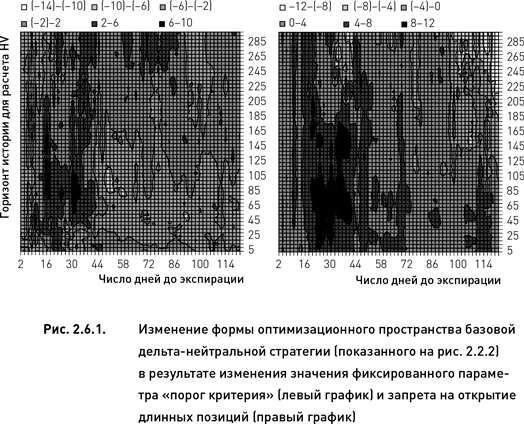 Исходное оптимизационное пространство имело единственную оптимальную область, протянувшуюся вдоль 30-й вертикали в диапазоне от 80 до 125 дней по параметру «период истории для расчета HV» (рис. 2.2.2). Левый график рис. 2.6.1 демонстрирует новое пространство, полученное в результате изменения фиксированного параметра. Прежняя оптимальная область сохранилась приблизительно на том же месте (незначительно сместившись вниз) и слегка увеличилась в размерах. Вместе с тем слева от оригинальной области появились четыре новые оптимальные области, две из которых очень маленькие, а две другие сопоставимы по размерам с прежней областью. Важно отметить, что, хотя количество оптимальных областей существенно выросло (пять вместо одной), все они располагаются приблизительно в левой нижней части оптимизационного пространства (12–36 дней по параметру «число дней до экспирации» и 40–180 по параметру «период истории для расчета HV»).
