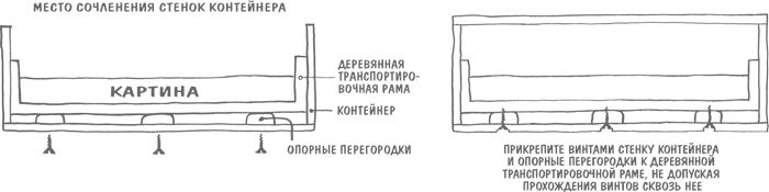6. Зафиксируйте на них транспортировочную раму. Отверстия делайте опять же дрелью с внешней стороны контейнера. Подберите винты: они должны быть не слишком короткими (чтобы надежно зафиксировать раму), но и не слишком длинными (чтобы не пробить ее насквозь и не повредить картину).