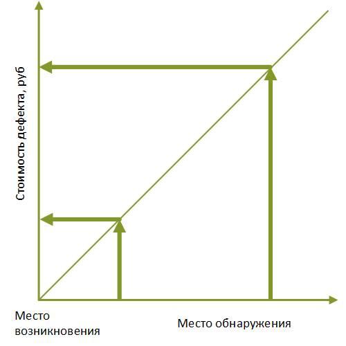 Не секрет, что стоимость дефектного изделия (см. рисунок 10.27) возрастает в разы по мере отдаления его от места возникновения, т. е. самым дешёвым окажется дефект, обнаруженный создавшим его работником в месте возникновения, а самым дорогим – дефект, вернувшийся в виде рекламации от Заказчика. Идеальное состояние в этой ситуации – обнаружение дефекта не в месте его возникновения, а на стадии проработки конструкторской и технологической документации при анализе рисков возникновения дефектов. Применительно к КПСЦ мы работаем с уже имеющимся уровнем брака и фактическими цифрами, которые необходимо сократить. Да, в результате в рассматриваемом потоке всё равно останутся дефекты, но они должны быть известны и незначительны, а поток выровнен.