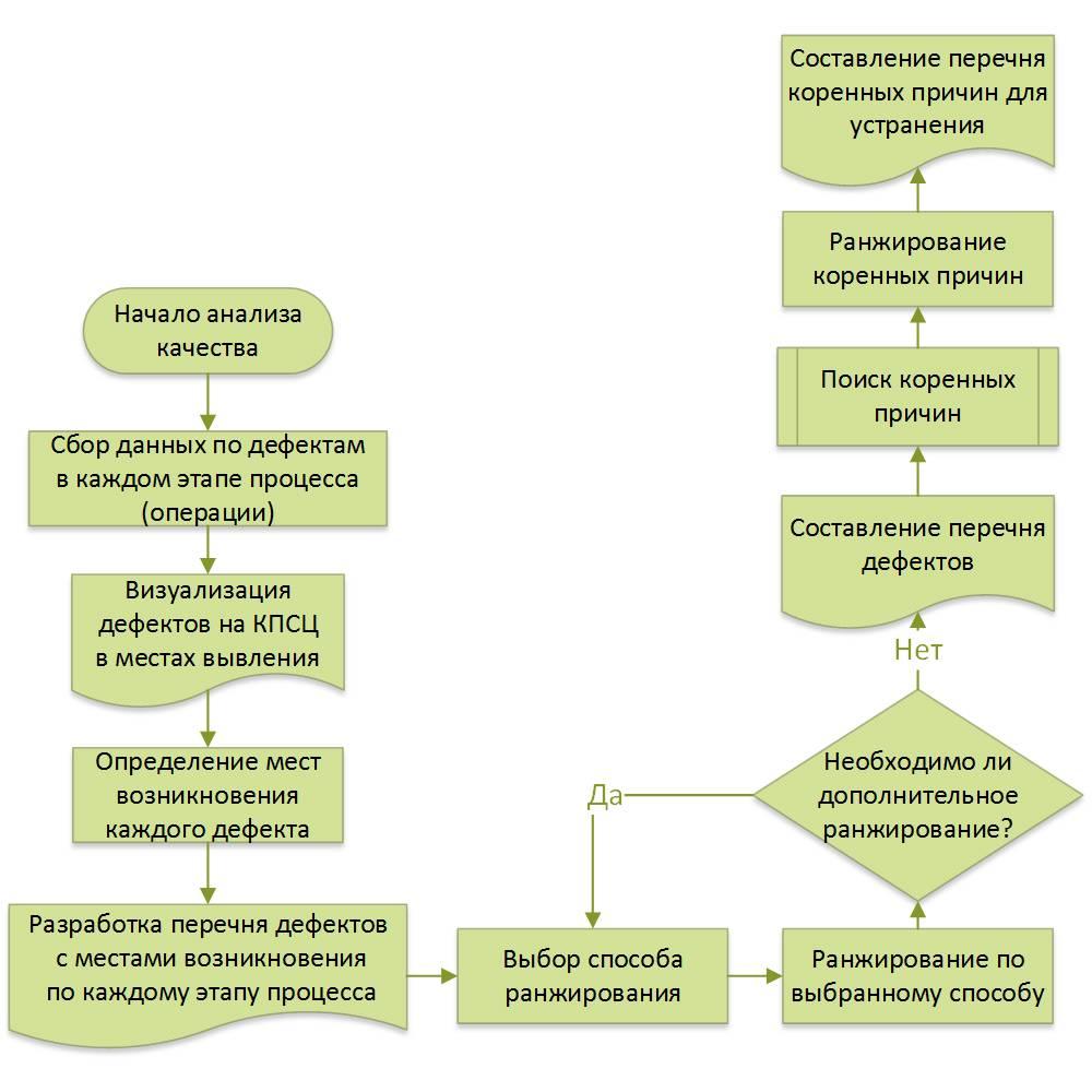 Анализ качества проводится МФГ с возможным привлечением экспертов из службы контроля качества на основании собранных статистических данных. Доля дефектности каждой операции визуализируется на КПСЦ, наиболее проблемные места выделяются отдельно. Суть всего процесса анализа сводится к двум направлениям: снижению доли особо значимых дефектов и обеспечению раннего выявления дефектов. То есть мы должны выделить наиболее повторяемые, дорогостоящие и опасные дефекты и насколько это возможно устранить причины их появления, а также сократить промежуток времени с момента возникновения дефекта до момента его обнаружения.