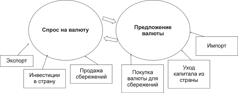 Вначале представим себе упрощённый вариант влияния на курс. В стране есть экспортёры, которые продают товар за пределы страны и получают валюту. Для ведения деятельности в стране им нужно обменять её на национальную валюту. Это главный поток предложения иностранной валюты. Но есть и импортёры. Они продают товар в стране, получают национальную валюту, а для покупки сырья или товаров за рубежом им нужно купить иностранную валюту для расчётов. Это главный поток спроса на валюту. В результате взаимодействия спроса и предложения устанавливается плавающий равновесный курс.