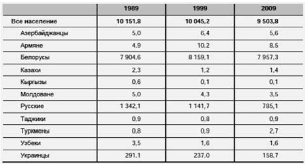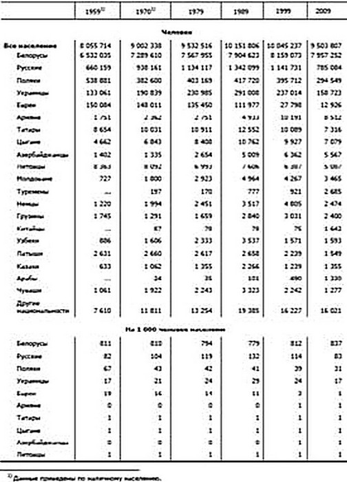 Национальный состав населения. По данным переписи 2009 г. в республике насчитывалось 9,5038 мл. чел., из которых доля белорусов составила 83,7 %, русских – 8,3 %, поляков – 3,1 %, украинцев – 1,7 %. Судя по данным Белстата, с 1989 г. по 2009 г. численность русских сократилась почти в два раза (табл. 3)[274]. При этом не было зафиксировано массового выезда русских (великороссов), этнических чисток, эпидемий и т. п.