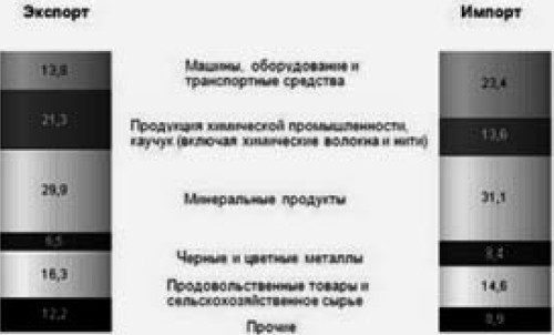 Улучшение экономической ситуации в 2000–2007 гг. было во многом обусловлено благоприятной внешней конъюнктурой при льготных ценах на углеводороды. В этот период ускоренно рос экспорт в третьи страны, благодаря чему отрицательное сальдо внешней торговли сократилось с 1,5 млрд долл, в 2000 г. до 0,7 млрд долл, в 2005 г.[251]